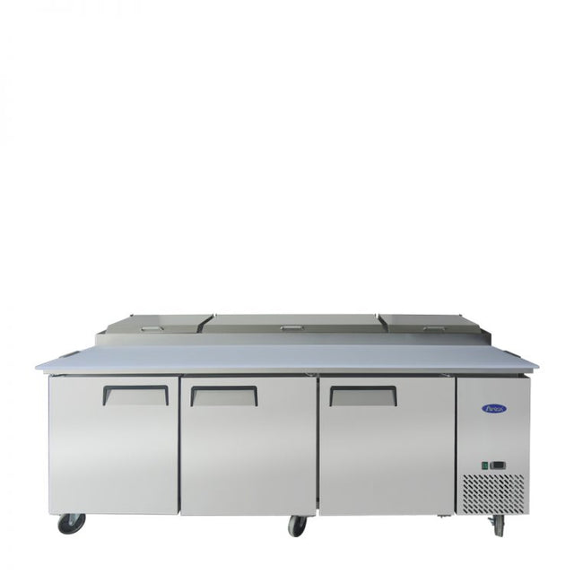 The Atosa Refrigerated Pizza Prep Table is a three-section unit measuring 93"W x 33-1/2"D x 44"H. It features side-mounted self-contained refrigeration with a capacity of 28.4 cu. ft. The table includes three self-closing hinged solid doors with locks, digital temperature control (33° to 38°F), automatic evaporation, and air defrost. It comes with six shelves, a 19-1/4" poly cutting board, and twelve 1/3 stainless steel pans. The interior and exterior are made of stainless steel, with a galvanized steel back. The unit is equipped with 5" casters, uses R290 Hydrocarbon refrigerant, and has a 1/4 HP motor, drawing 3.1 amps at 115v/60/1-ph. It includes a cord with a NEMA 5-15P plug and is cETLus and ETL-Sanitation certified.