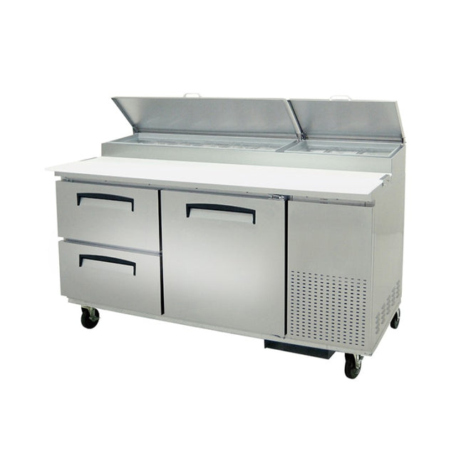 The Fogel MPP-67D pizza prep table is a robust and feature-rich solution designed for efficient food preparation. Crafted with a durable stainless steel top, front, and sides, this table ensures long-lasting performance and easy cleaning. The aluminum interior lining provides excellent insulation and maintain a consistent temperature, while the self-closing doors with hermetic seal guarantee optimal food preservation. Heavy-duty chrome plated hinges and recessed handles offer both stability and a sleek aesthetic. Reinforced adjustable shelves, coated in epoxy for added protection, provide ample storage space for ingredients and supplies. Bumpers on the back safeguard the unit from accidental damage, while 6' heavy-duty casters enable smooth mobility. The table boasts a spacious 18 cu. ft. capacity, accommodating (9) 1/3 size polypropylene pans for efficient ingredient storage. A 19' wide NSF-approved polyethylene cutting board offers a dedicated work surface for food preparation, while a 12 inch cutting board adds further utility. The MPP-67D incorporates a forced air evaporator, which ensures rapid temperature “pull down,” keeping ingredients fresh. A self-contained, heavy-duty 134a condensing unit ensures reliable cooling performance. This versatile prep table, certified to ANSI/NSF 7 standards for safety and hygiene, is an ideal addition to any busy kitchen environment.