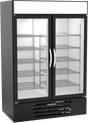 The MarketMax™ Freezer Merchandiser is a reach-in, two-section unit with a 46.2 cu. ft. capacity. It features two triple-pane hinged glass doors, electronic control with a digital display, and ten epoxy-coated steel shelves. The interior is illuminated with LED lighting, and it has a lighted sign panel. The self-closing door includes an automatic hold-open feature, and the refrigeration system is bottom-mounted. The exterior is black, and it uses R404A refrigerant. It is powered by a 3/4 HP motor and is cULus, UL EPH Classified, and UL-Sanitation certified. This product is made in the USA.