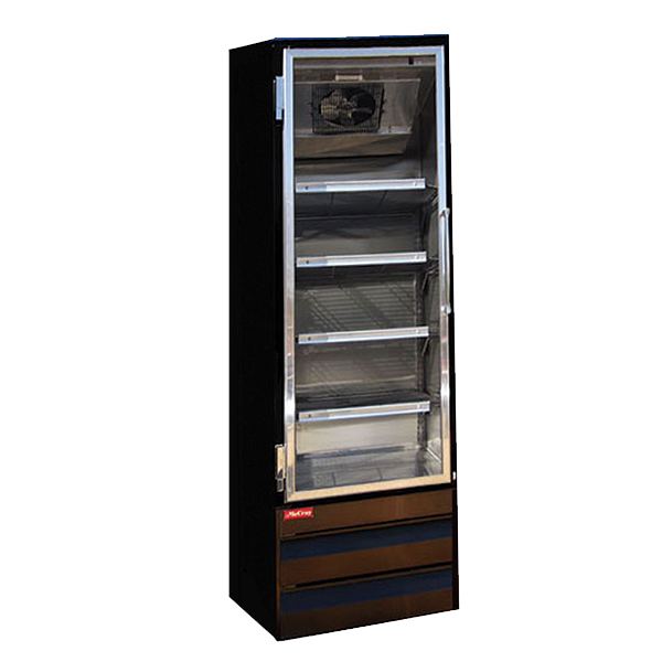 The Howard McCray GF22BM-LT-B 26.50' Glass-Front Refrigerator is a heavy-duty, UL Classified unit designed to meet the stringent standards of ANSI/NSF 7. Its construction features foamed-in-place, CFC-free foam for enhanced insulation, while the removable front grille allows for easy servicing. The interior boasts white, black, or stainless steel aluminum ends and rear, along with matching floors and an aluminum evaporator fan housing. Each door is equipped with four heavy-duty epoxy-coated shelves, providing ample storage space.