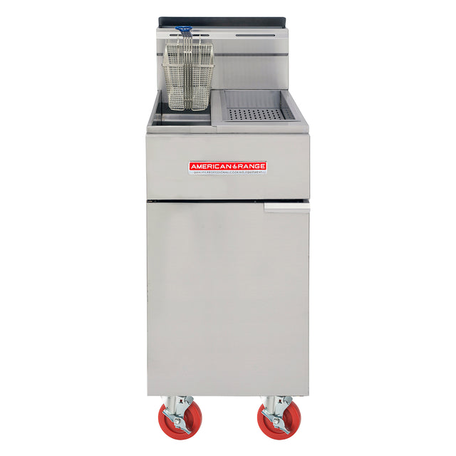 freidora, gas, 25 lb. de capacidad de aceite, termostato mecánico, sistema piloto de milivoltios, (1) canasta de freidora, estación de descarga, quemadores infrarrojos, recipiente para freír de acero inoxidable con fondo inclinado, tanque y exterior, ruedas, 23,0 kW, 80 000 BTU, ETL -Saneamiento, cETLus, Hecho en EE.UU.